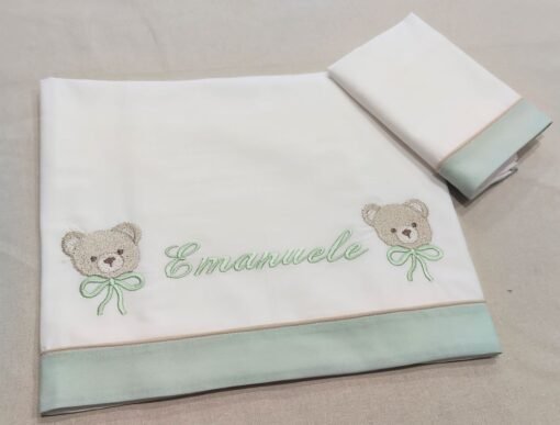 Il lenzuola è bordato con elegante cotone color verde acqua, una tonalità delicata e raffinata che dona un tocco di freschezza e armonia. Al centro è personalizzato con il nome del bebè in verde acqua , rendendo questo prodotto unico e speciale.