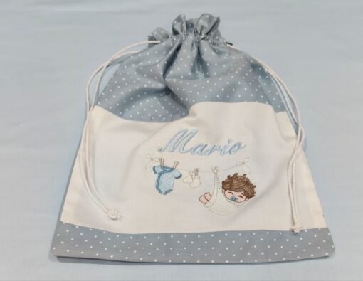 Sacca primo cambio per neonato realizzata in elegante tessuto piquet celeste polvere poi micro, abbinato a delicato piquet bianco, perfetta per contenere tutto l’occorrente per i primi cambi del bebè con stile e praticità. La sacca misura 30×40 cm, una dimensione ideale per organizzare pannolini, cambi di vestitini e accessori indispensabili, sia a casa che fuori .Il design è impreziosito da una dolce fantasia coordinata e da un raffinato ricamo realizzato con colori delicati, che dona un tocco di eleganza e unicità. La sacca è inoltre personalizzabile con il nome del bebè, rendendola un accessorio esclusivo e speciale.