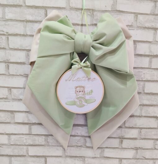 Fiocco nascita realizzato in delicato cotone nei raffinati toni tortora e verde salvia, perfetto per annunciare con dolcezza e stile l’arrivo del tuo bebè.Il fiocco è impreziosito da un elegante telaio pendente con un delicato ricamo dai colori armoniosi, studiato per creare un effetto raffinato e senza tempo. Il ricamo può essere personalizzato con il nome del bebè, rendendo ogni creazione unica e speciale.