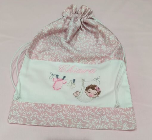 Sacca primo cambio per neonato realizzata in elegante tessuto piquet fantasia rosa, abbinato a delicato piquet bianco, perfetta per contenere tutto l’occorrente per i primi cambi del bebè con stile e praticità .La sacca misura 30×40 cm, una dimensione ideale per organizzare pannolini, cambi di vestitini e accessori indispensabili, sia a casa che fuori. Il design è impreziosito da una dolce fantasia coordinata e da un raffinato ricamo realizzato con colori delicati, che dona un tocco di eleganza e unicità. La sacca è inoltre personalizzabile con il nome del bebè, rendendola un accessorio esclusivo e speciale.