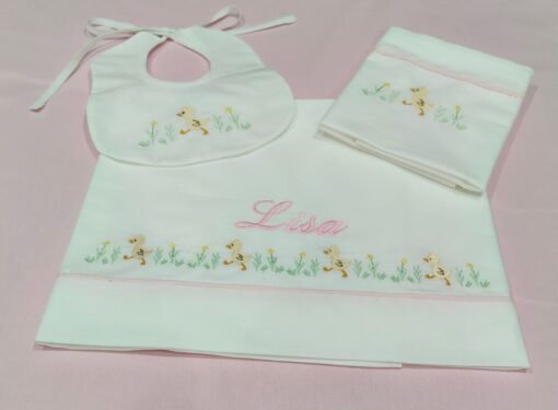 Tutti gli elementi del set sono realizzati in elegante cotone bianco di alta qualità e impreziositi da un raffinato ricamo dai delicati colori pastello, pensato per donare un tocco di dolcezza e armonia. Il design semplice ma elegante si adatta perfettamente sia a corredini classici che moderni. personalizzato con il nome del bebè