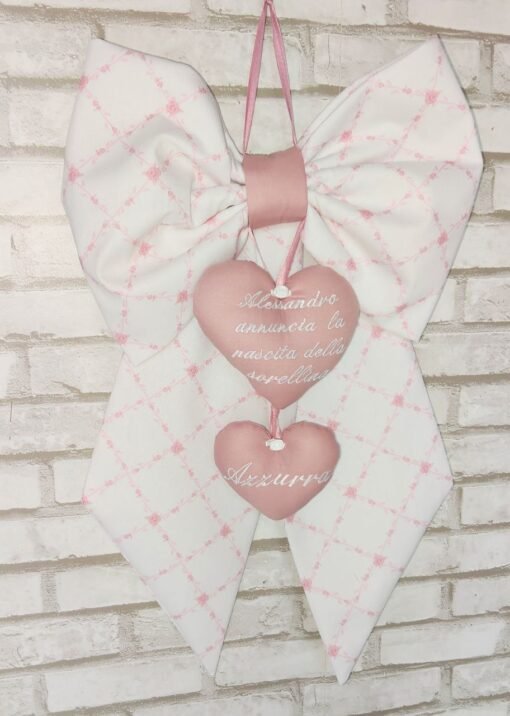 Fiocco nascita realizzato in delicato piquet fantasia rosa ,abbinato a morbido cotone color rosa antico, perfetto per annunciare con dolcezza e tenerezza l’arrivo della sorellina .Il design elegante e armonioso unisce fantasie delicate a tonalità raffinate, creando un effetto romantico e senza tempo. Ideale da appendere alla porta di casa o nella cameretta, dona un tocco accogliente e speciale per celebrare un momento unico. .Dimensioni