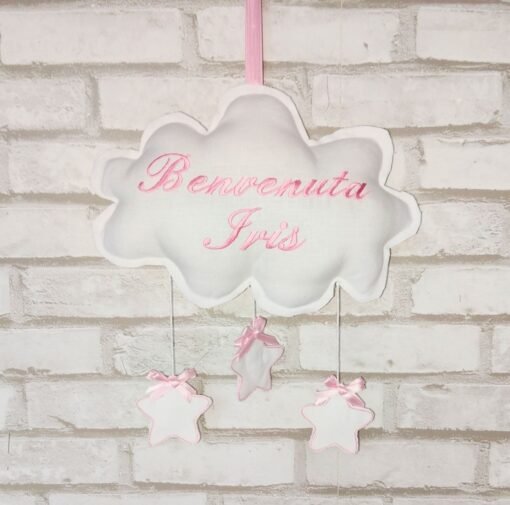 Fiocco nascita a forma di nuvola, realizzato in pregiato lino bianco, elegante e delicato, ideale per annunciare con dolcezza l’arrivo del tuo bebè. Il design, dolce e sognante, è arricchito da graziose stelline pendenti, anch’esse realizzate in lino bianco, che donano movimento e leggerezza alla composizione. La forma a nuvola rende il fiocco ancora più tenero e perfetto per creare un’atmosfera magica e accogliente. personalizzabile con il nome del bebè, rendendolo unico, speciale e perfetto anche come ricordo da conservare nel tempo .