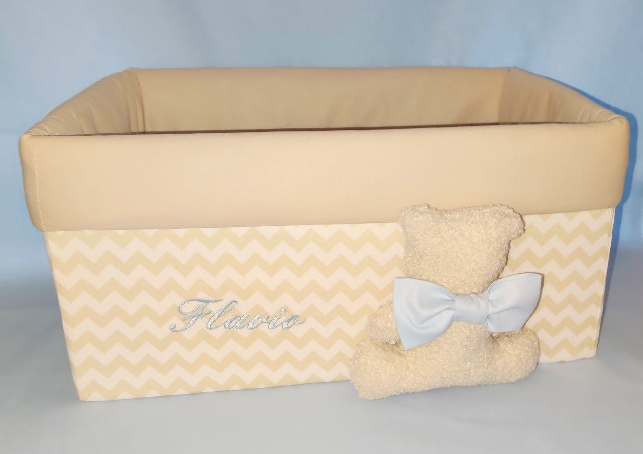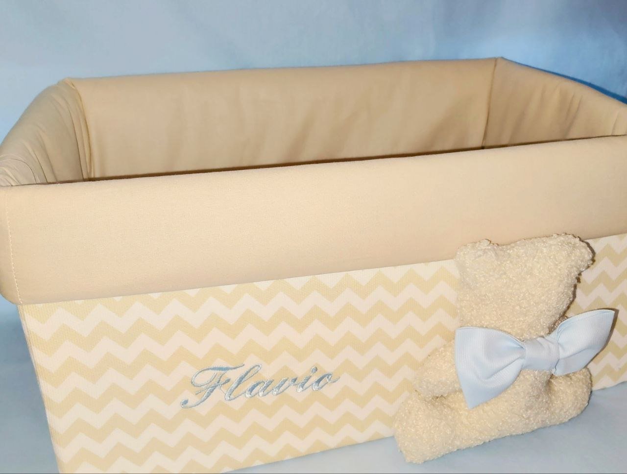 Cesta portaoggetti neonati   è l’accessorio perfetto per organizzare con stile e tenerezza lo spazio del tuo piccolo. Realizzata a mano in cotone color tortora abbinato a piquet fantasia, unisce eleganza e praticità diventando un elemento decorativo ideale per la cameretta. Il design è impreziosito da un tenero orsetto tendi applicato sulla scatola, che dona un tocco di dolcezza e unicità. Inoltre,  personalizzabile con il nome del bebè rende ogni pezzo esclusivo, perfetto anche come idea regalo per nascita ..Con le sue dimensioni di circa 25 x 40 cm altezza 20, è capiente e funzionale: perfetta per contenere accessori, piccoli indumenti, prodotti per la cura del neonato o ricordi preziosi.