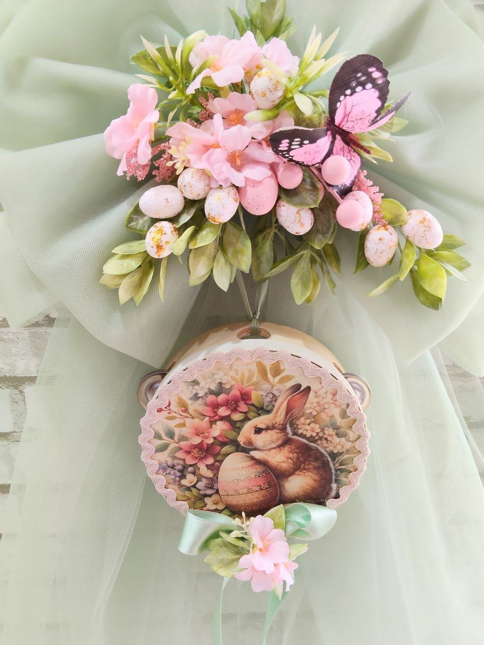 Delicata ed elegante decorazione di Pasqua composta da un soffice fiocco in tulle color verde salvia, tonalità raffinata e primaverile che dona un tocco fresco e naturale ai tuoi ambient i.Al centro è impreziosita da un tamburello decorativo con stampa a tema pasquale dal diametro di 15 cm, che rende la composizione originale e ricercata. Il tutto è arricchito da fiori primaverili dai colori delicati e da graziose ovette decorative, perfettamente abbinate per creare un’atmosfera festosa e accogliente .Altezza totale: circa 70 cmPerfetta da appendere alla porta d’ingresso, in casa o per decorare vetrine e ambienti durante il periodo pasquale. Realizzata con cura nei dettagli, ideale anche come idea regalo artigianale.
