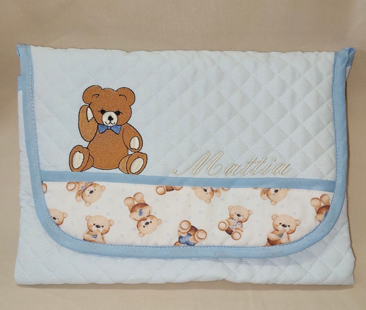 Il fasciatoio è impreziosito da un delizioso orsetto ricamato ed è personalizzato con il nome del bebè, un dettaglio che lo rende unico e ideale anche come tenero ricordo dei primi mesi.