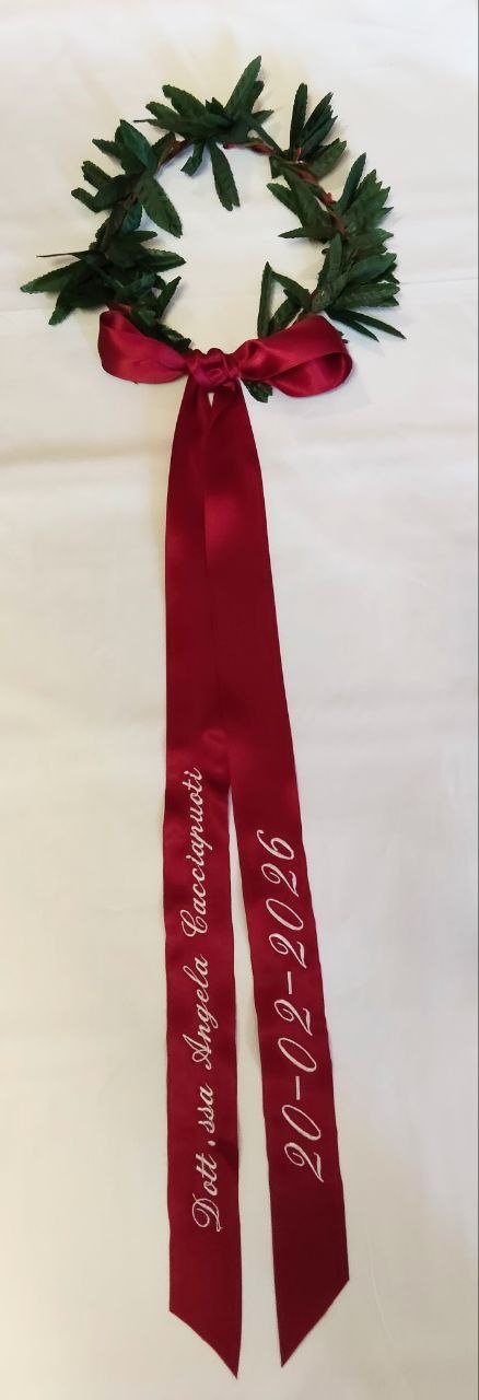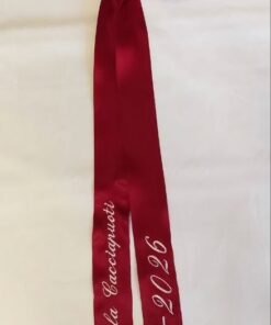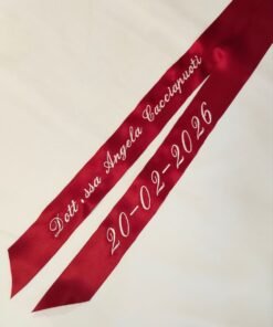 Fiocco laurea personalizzato realizzato con nastro rosso bordato e ricamo bianco, simbolo della tradizione e del traguardo raggiunto.