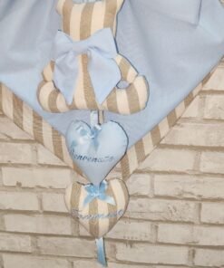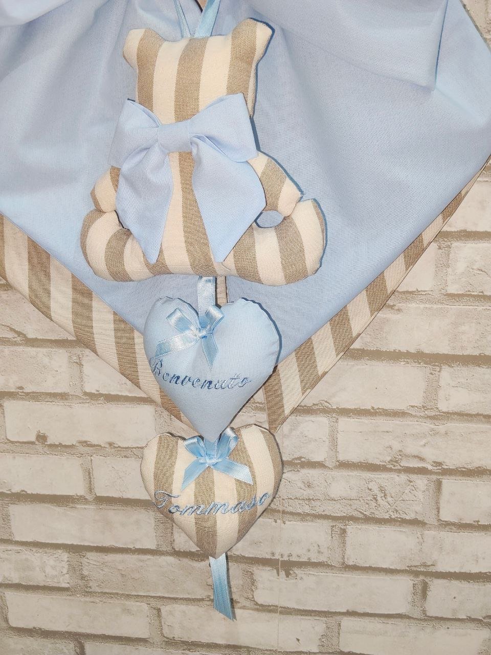 Il fiocco, dalla forma armoniosa e morbida, è impreziosito da un tenero orsetto , modellato con cura nei dettagli per trasmettere dolcezza e accoglienza.