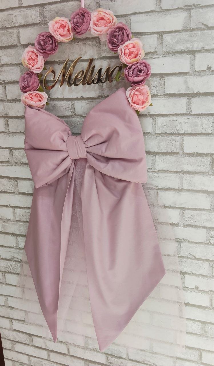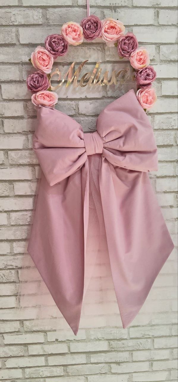 Fiocco nascita realizzato in morbido cotone rosa antico e impreziosito da prezioso tulle rosa, lavorato con cura artigianale per dare vita a un accessorio elegante e romantico. La composizione presenta un cerchio dal diametro di 30 cm, decorato con delicati fiori nei toni del rosa e del rosa antico, che donano armonia e raffinatezza .ll fiocco ha un’altezza totale di 90 cm, dimensione importante che lo rende ben visibile e d’effetto, perfetto per accogliere e annunciare con gioia la nascita .Al centro del cerchio spicca il nome del bebè in plexiglass oro, un dettaglio luminoso e prezioso che rende il fiocco unico e personalizzato, ideale per celebrare l’arrivo di una nuova vita con stile ed eleganza.