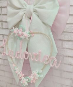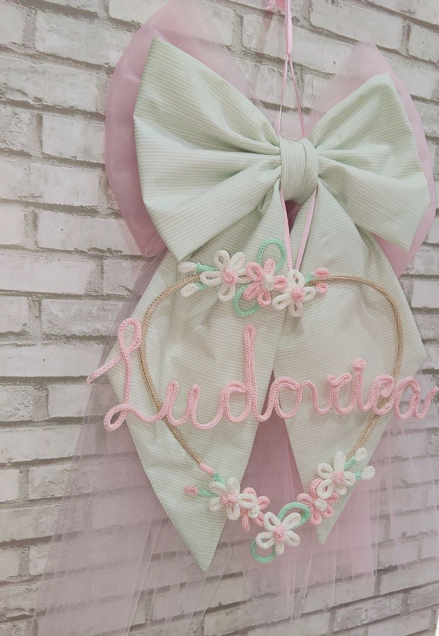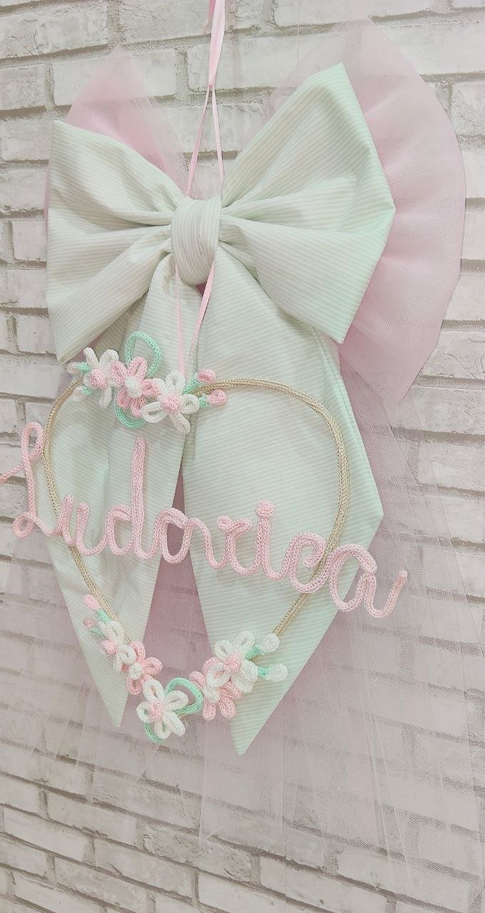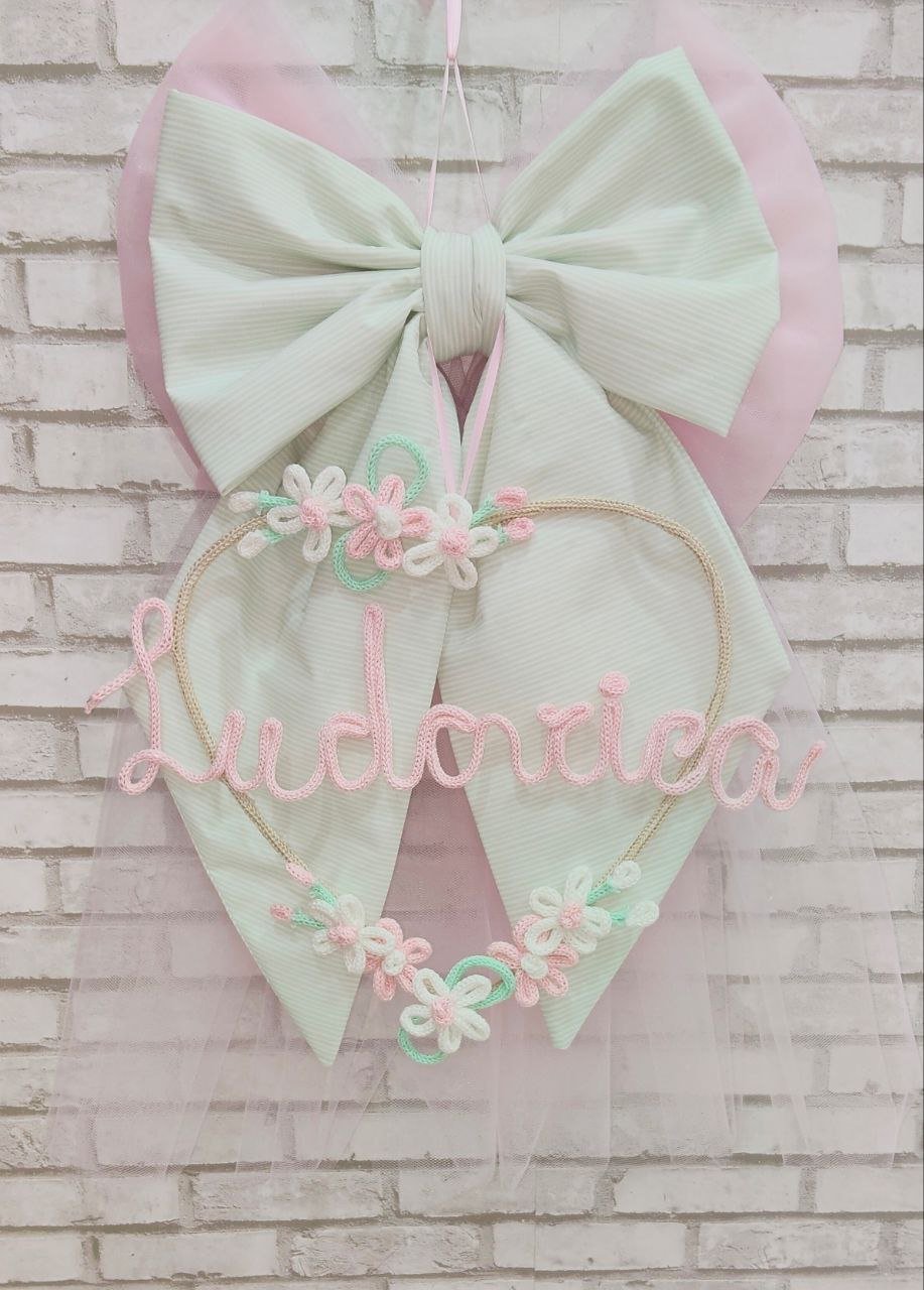 Fiocco nascita realizzato in tulle rosa delicato e cotone fantasia verde acqua, creando un effetto romantico e raffinato, ideale per accogliere la nuova arrivata con dolcezza .Al centro del fiocco pende un cuore di circa 35 cm di diametro, impreziosito da deliziosi fiorellini rosa e bianchi realizzati con la tecnica del tricotin, che donano un tocco poetico e unico alla composizione .La personalizzazione con il nome del bebè, anch’essa realizzata in tricotin, rende questo fiocco un pezzo unico e speciale, perfetto da appendere alla porta di casa, nella cameretta o da regalare come ricordo prezioso. Con i suoi 70 cm di altezza, è una decorazione elegante e d’effetto che accompagnerà con dolcezza questo momento indimenticabile