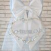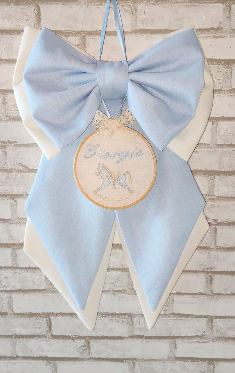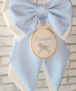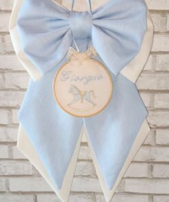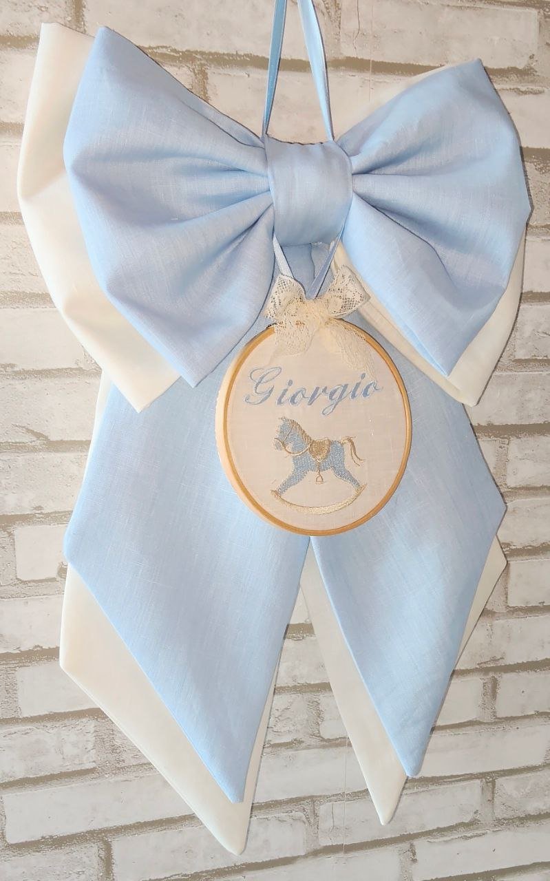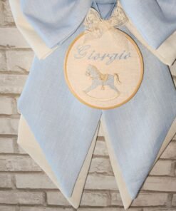 Al centro del fiocco pende un cerchio di 15 cm di diametro, finemente ricamato con un cavalluccio a dondolo e il nome del bebè, creando un insieme armonioso e raffinato. Ogni dettaglio è curato con amore: i toni tenui del lino, la morbidezza dei tessuti e la delicatezza del ricamo rendono questo fiocco un piccolo capolavoro artigianale, altezza cm 50 .Un fiocco elegante e senza tempo, perfetto per celebrare un momento unico e indimenticabile.