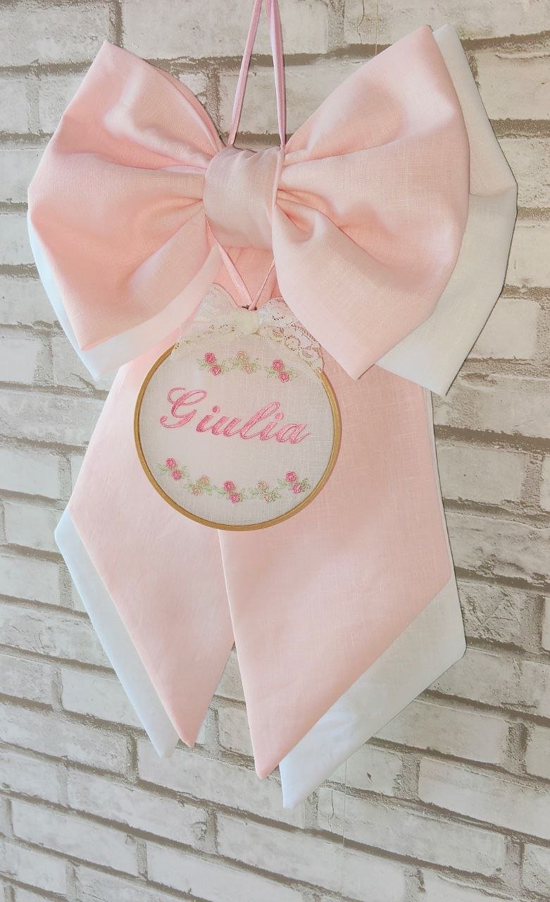 Fiocco nascita in lino bianco e rosa è realizzato interamente a mano, con cura e amore per ogni dettaglio.