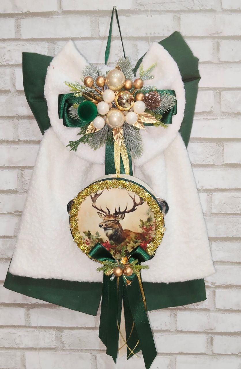 .Al centro del fiocco pende un delizioso tamburello decorativo con una fantastica stampa natalizia, ricca di dettagli che richiamano la magia e la tradizione delle feste. Ogni particolare è curato con attenzione, rendendo questa creazione unica e speciale .Con i suoi 55 cm di altezza