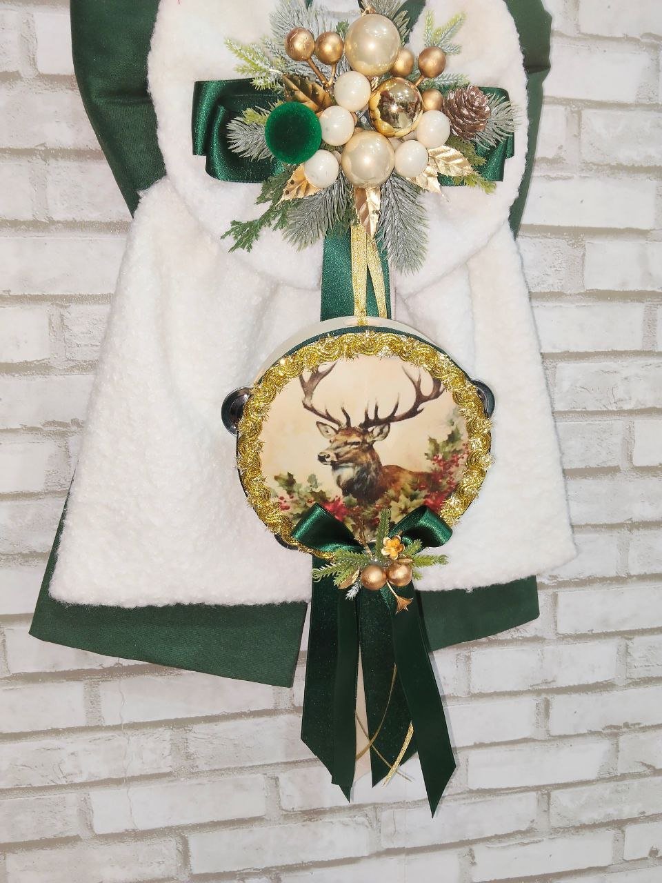 Fiocco natalizio artigianale realizzato in cotone verde muschio e morbido teddy bianco, pensato per donare alla tua casa un’atmosfera calda, accogliente e raffinata durante il periodo natalizio.