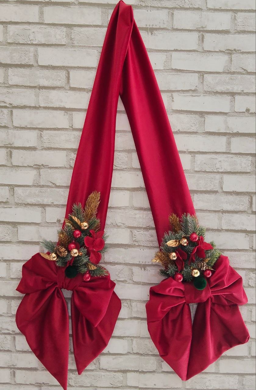 Fiocco natalizio decorativo di grande eleganza, pensato per arricchire l’atmosfera delle feste con un tocco di stile tradizionale e raffinato. La struttura è composta da una fascia centrale , che funge da elemento principale del design, dalla quale scendono armoniosamente due fiocchi pendenti realizzati in pregiato velluto rosso. Il velluto, soffice e luminoso, dona profondità e calore alla decorazione, creando un effetto ricco e accogliente .Questo fiocco è ideale per essere appeso alla porta d’ingresso,  altezza   totale 1,90