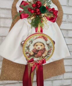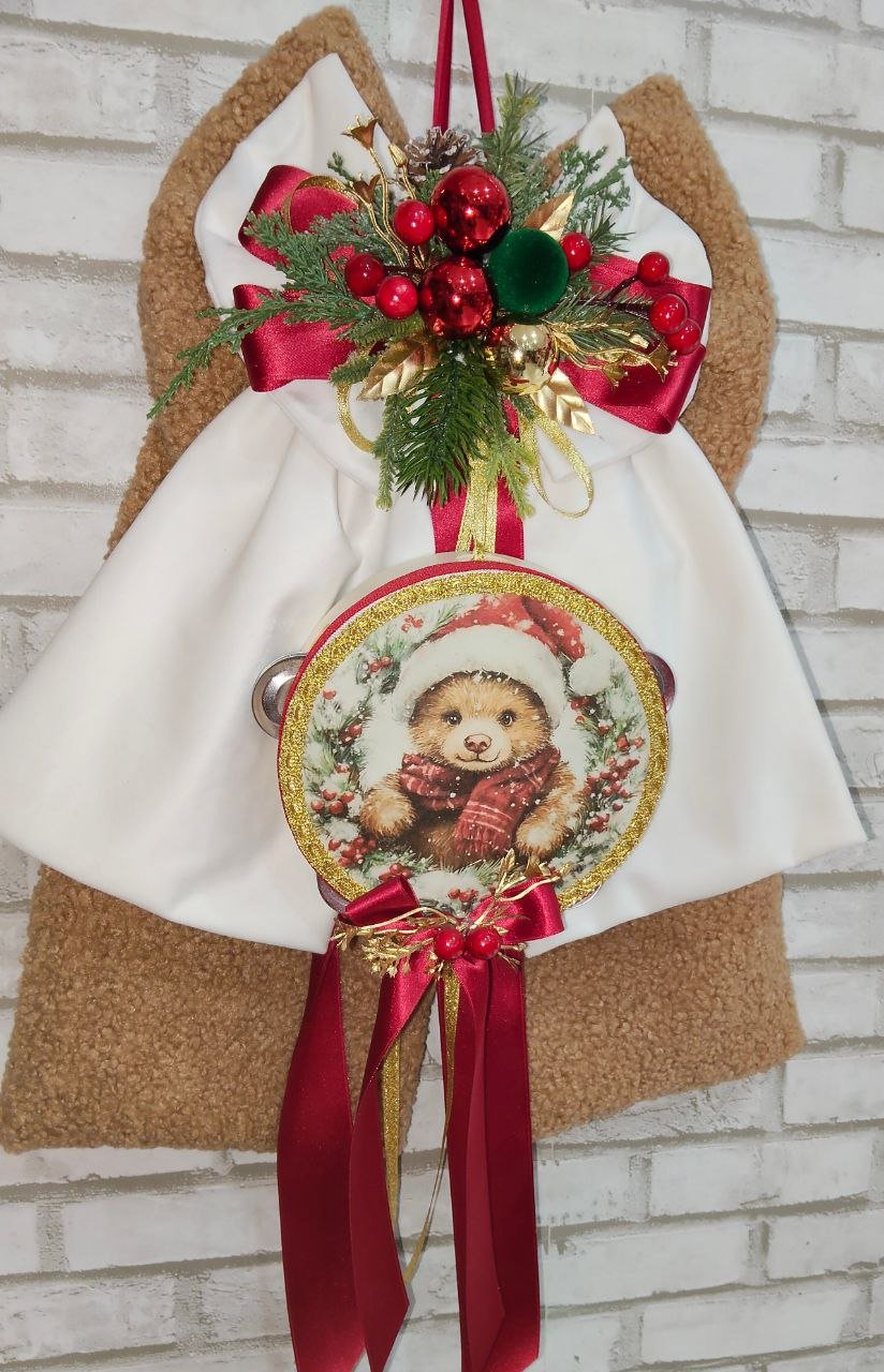 Fiocco natalizio artigianale elegantissimo, realizzato con materiali di alta qualità e studiato nei minimi dettagli per donare un tocco di charme e calore alla tua casa. Confezionato in morbida stoffa teddy beige abbinata a velluto color panna, questo fiocco unisce dolcezza, eleganza e tradizione, trasformando ogni ambiente in un angolo accogliente e festoso .Al centro incantevole tamburello decorativo dal diametro di 16 cm, arricchito da una deliziosa stampa con orsetto che richiama la magia del Natale e la tenerezza delle feste in famiglia.in altezza cm 50