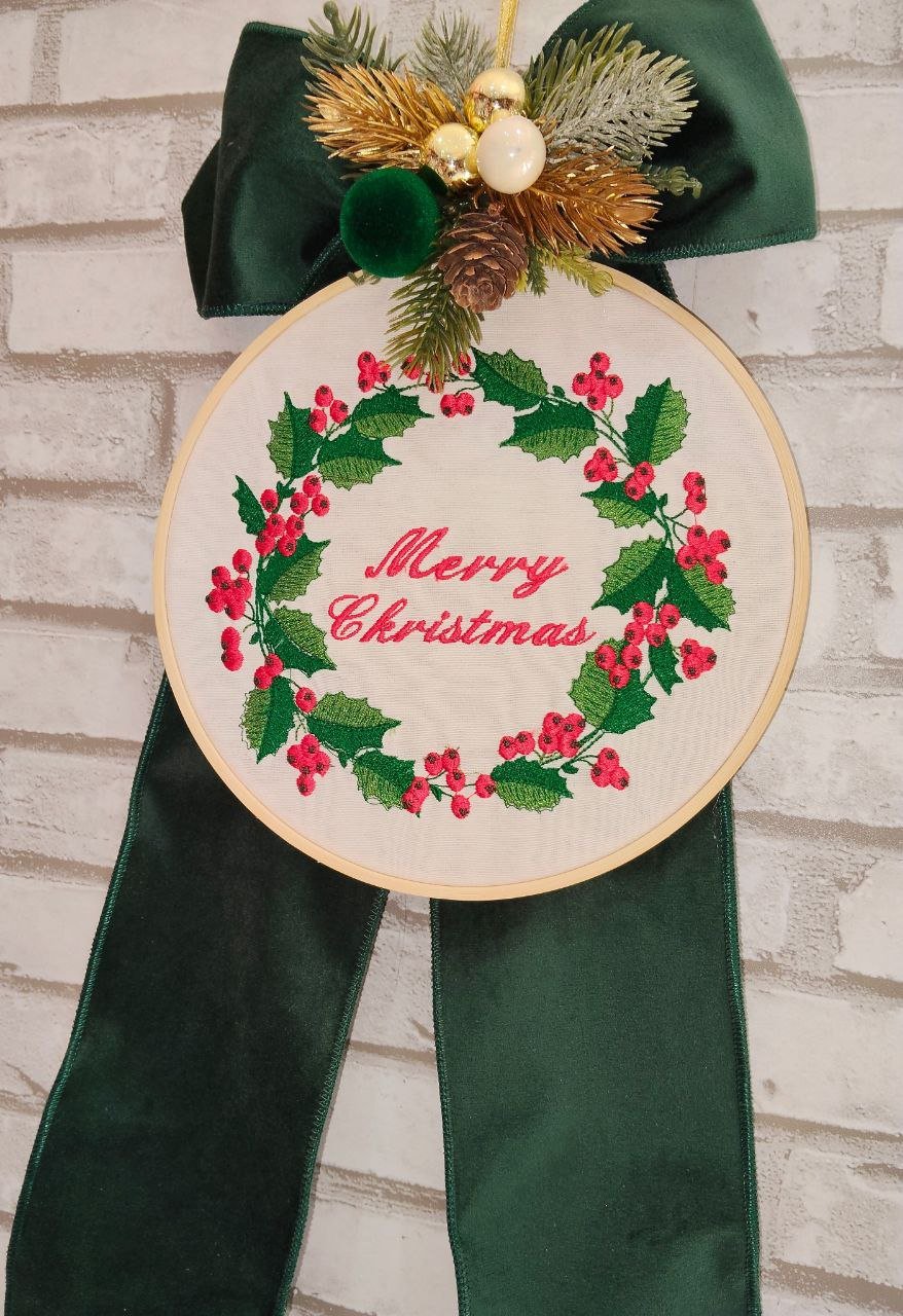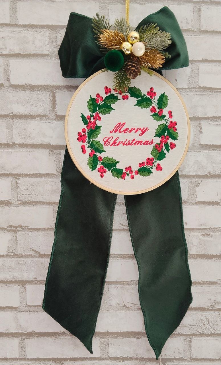 Fuoriporta natalizio elegante e ricercato, realizzato con un morbido nastro in velluto verde muschio che dona un tocco raffinato e caldo all’ambiente. Al centro della composizione è presente un telaio dal diametro di 21 cm, finemente ricamato a macchina, con motivi natalizi che richiamano la magia e la tradizione delle festività.La decorazione è impreziosita da addobbi natalizi sapientemente posizionati: piccoli rami verdi, bacche rosse, dettagli dorati e altri elementi tematizzati completano il design, creando un effetto armonioso e raffinato  . Con un’altezza totale di circa 55 cm, questo fuoriporta è ideale per arricchire porte d’ingresso