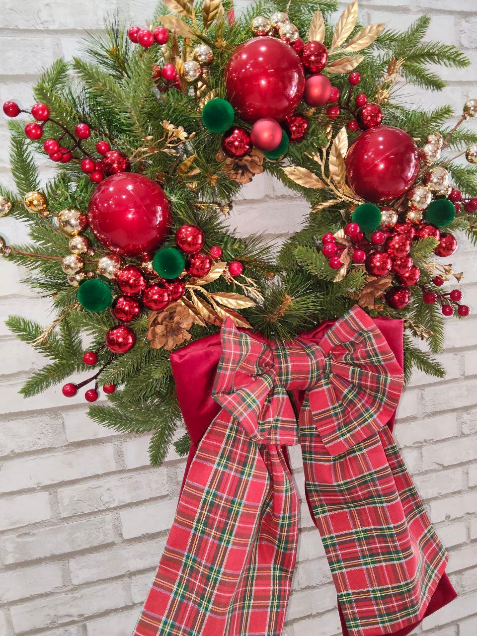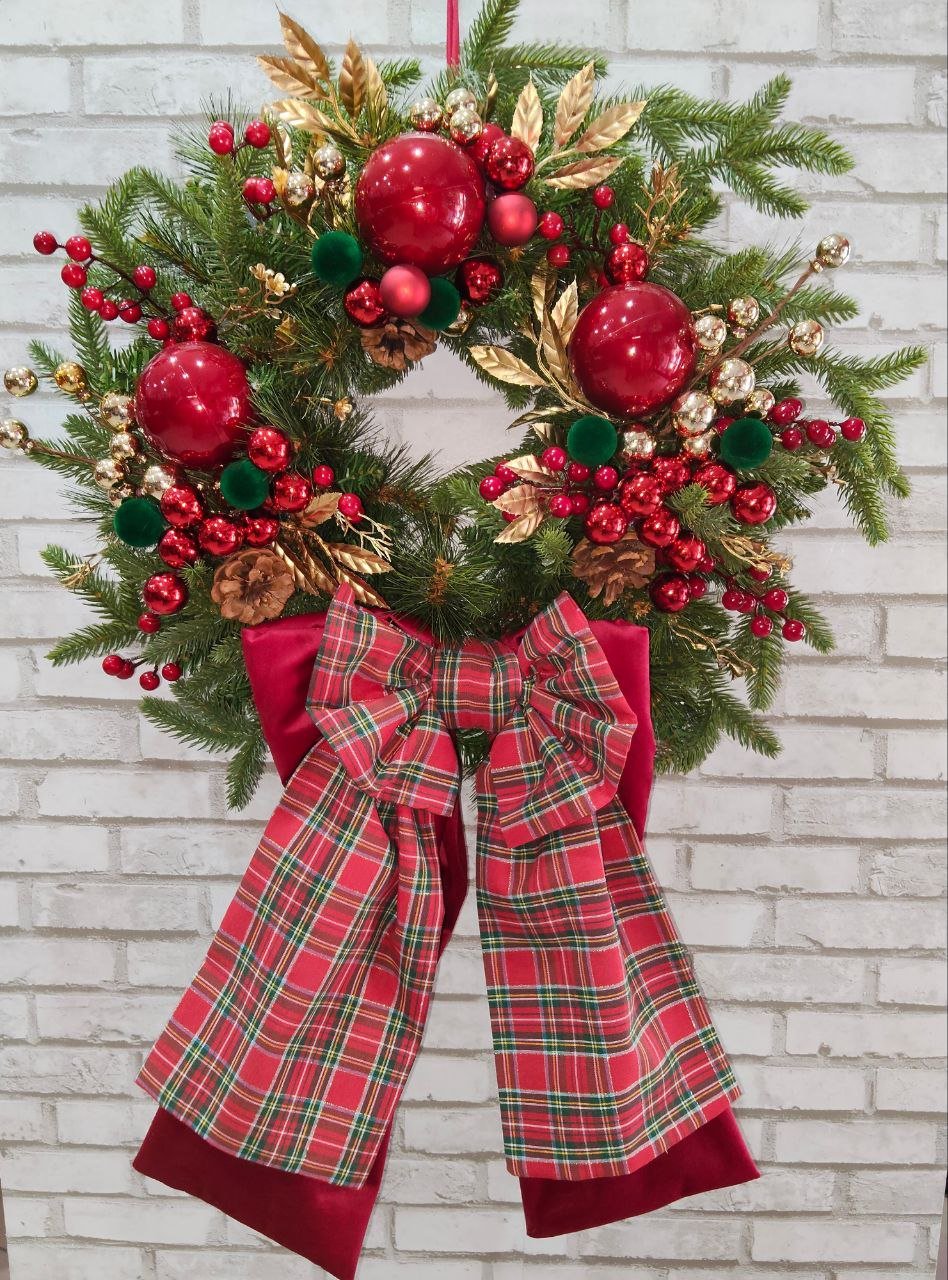 Fuoriporta natalizio – Corona 50 cm con fiocco in velluto rosso e tartan