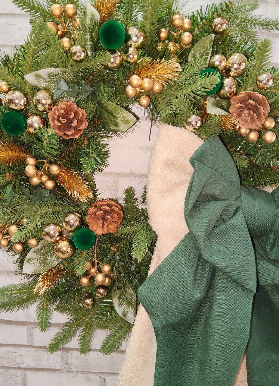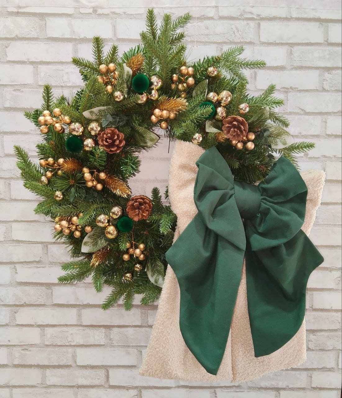 Realizzata con cura e impreziosita da un elegante fiocco in teddy, rifinito con stoffa  verde muschio per un tocco classico e raffinato. Il fiocco ha un’altezza di 45 cm, dando alla decorazione un aspetto scenografico e imponente.