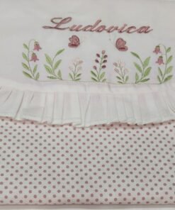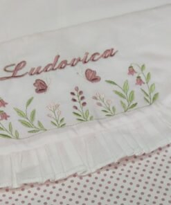 Sacca primo cambio realizzata in cotone a righe rosa cipria, delicata e raffinata, ideale per accompagnare i primi momenti fuori casa del bebè .La sacca è impreziosita da un delizioso riccio decorativo e da un ricamo fine e curato, realizzato con dolci sfumature che donano armonia e tenerezza al design. Personalizzata con il nome del bebè, rendendo ogni pezzo unico e speciale. Pratica e capiente, è perfetta per contenere il necessario per il primo cambio in ospedale o per le uscite quotidiane.